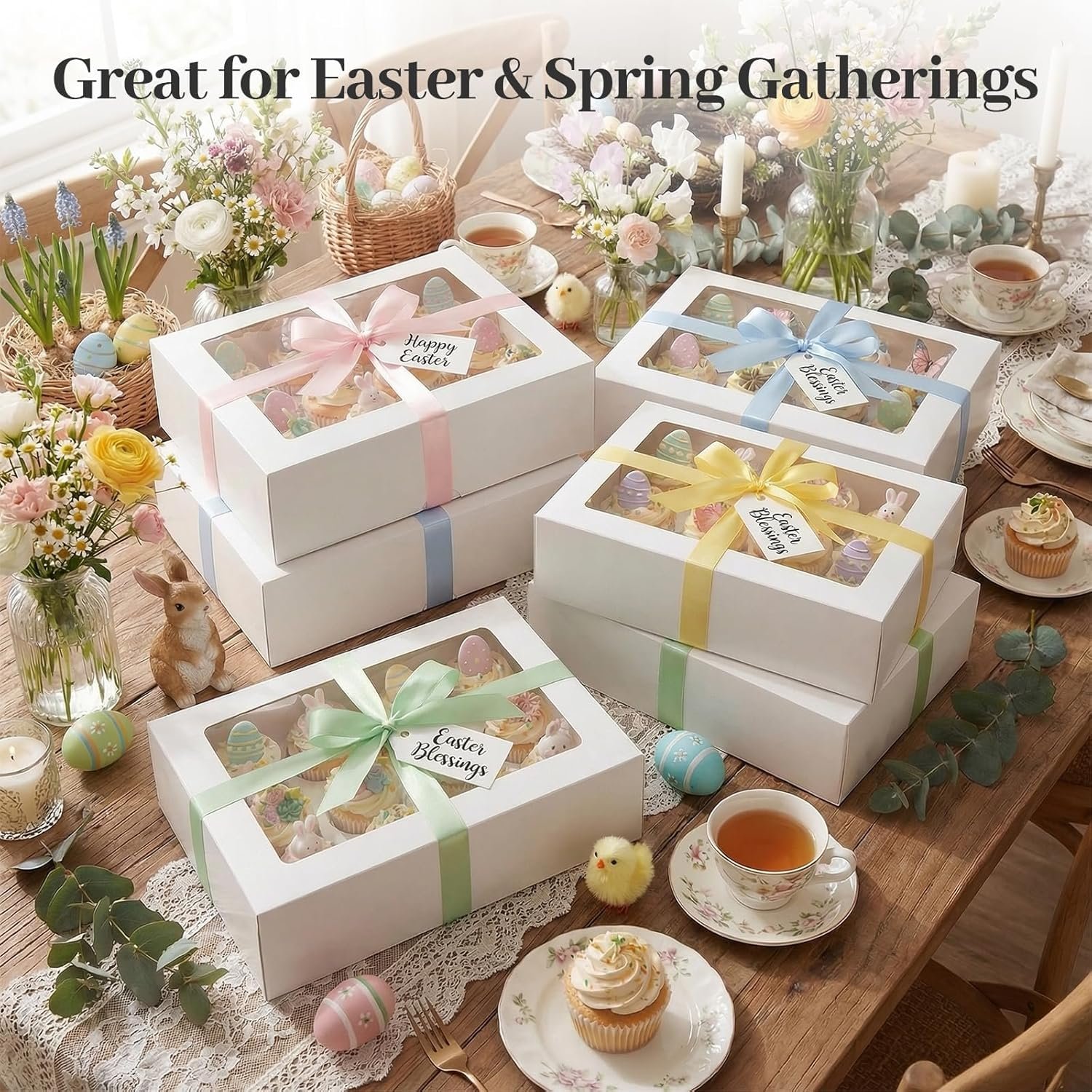 • Versatilidad para Regalos de Vacaciones: Estas cajas de 13.2 x 9.8 x 4 pulgadas son perfectas no solo para cupcakes; úsalas para donuts de Pascua, muffins o grandes cantidades de galletas. Añade una cinta de primavera para un aspecto profesional y personalizado durante las festividades.
